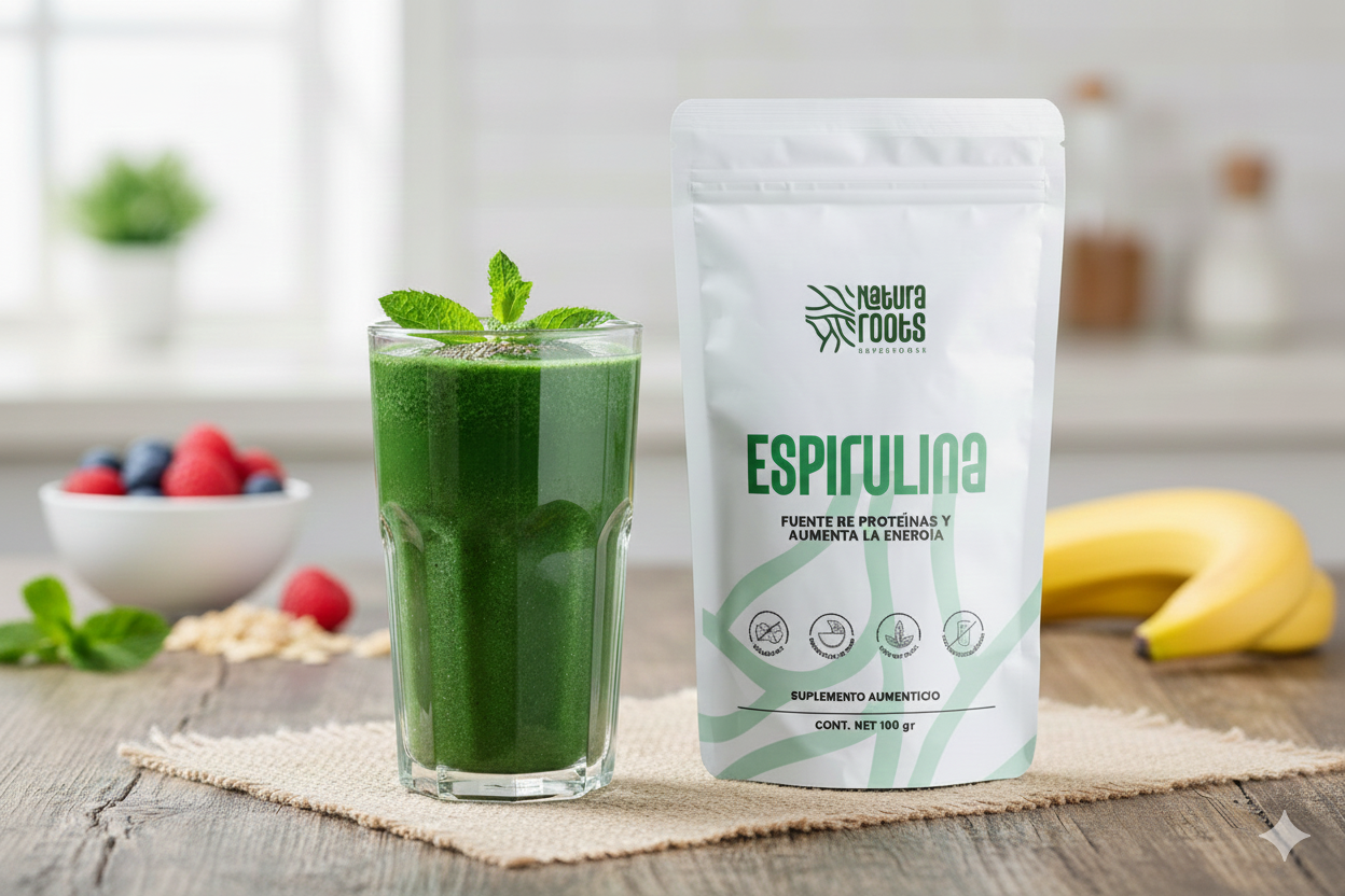 Nuestra Espirulina en polvo Natura Roots® es 100% pura, sin azúcares añadidos ni ingredientes artificiales. Conserva su color verde intenso y su perfil natural, ideal para integrarse de forma consciente en tu día a día.